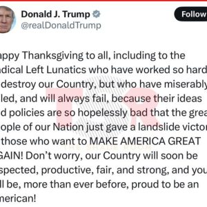 Former President Donald Trump posted a fiery Thanksgiving message, targeting the “Radical Left Lunatics” for their failed efforts to “destroy our country.” He claimed the nation gave a landslide victory…